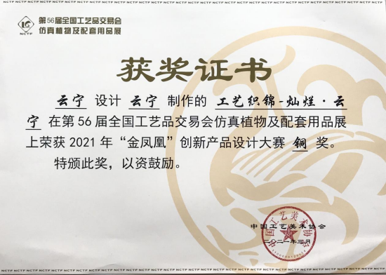 4、第56届全国工艺品交易会仿真植物及配套用品展上荣获2021年“金凤凰”创新产品设计大赛“铜奖”。