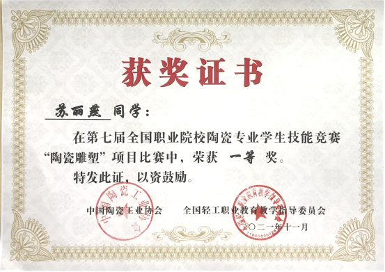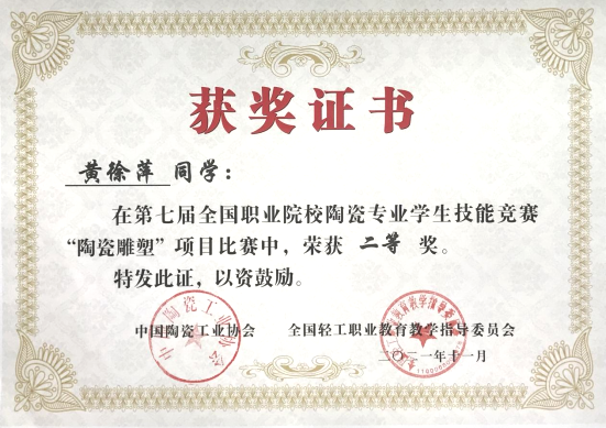 1、第七届全国职业院校陶瓷专业学生技能竞赛“雕塑陶瓷”项目比赛“一等奖”。