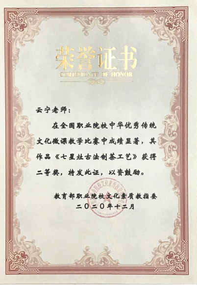 2、2020全国职业院校中华优秀传统文化微课教学比赛“二等奖”。