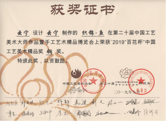 3、第二十届中国工艺美术大师作品暨手工艺术精品博览会上荣获2019“百花杯”中国工艺美术精品奖“铜奖”。