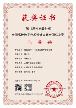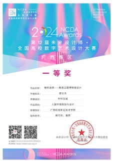 第12届未来设计师·全国高校数字艺术设计大赛(广西赛区)获一等奖1项、二等奖1项 ,全国赛区三等奖1项。