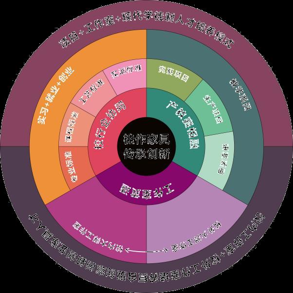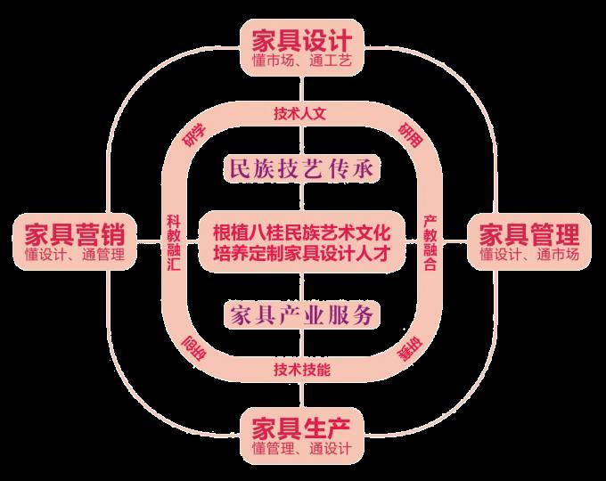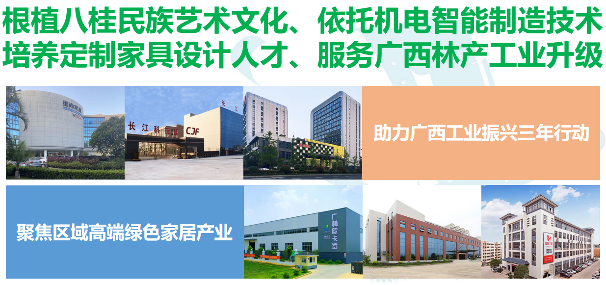 专业以“根植八桂民族艺术文化、依托机电智能制造技术、培养定制家具设计人才、服务广西林产工业升级”为理念,紧密对接广西高端绿色家具家居产业集群,开创了“校行企协同·工作室贯通·产教赛相融”培养模式,以及“四位一体·通专结合”教学模式。专业根据家具产业细分要求实行分方向培养,其中家具艺术设计专业聚焦“智能家具+智慧家居”,涵盖智能家居、智能办公、智能照明和老年康养等领域;家具艺术设计(全屋定制设计)专业聚焦“数字定制+整家整装”,涵盖定制家具、定制门窗、定制软装和全案整装等领域。