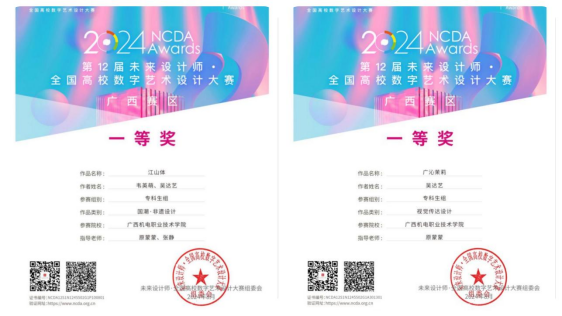 2024全国高校数字艺术大赛区赛一等奖、2023广西大学生艺术展演区赛一等奖