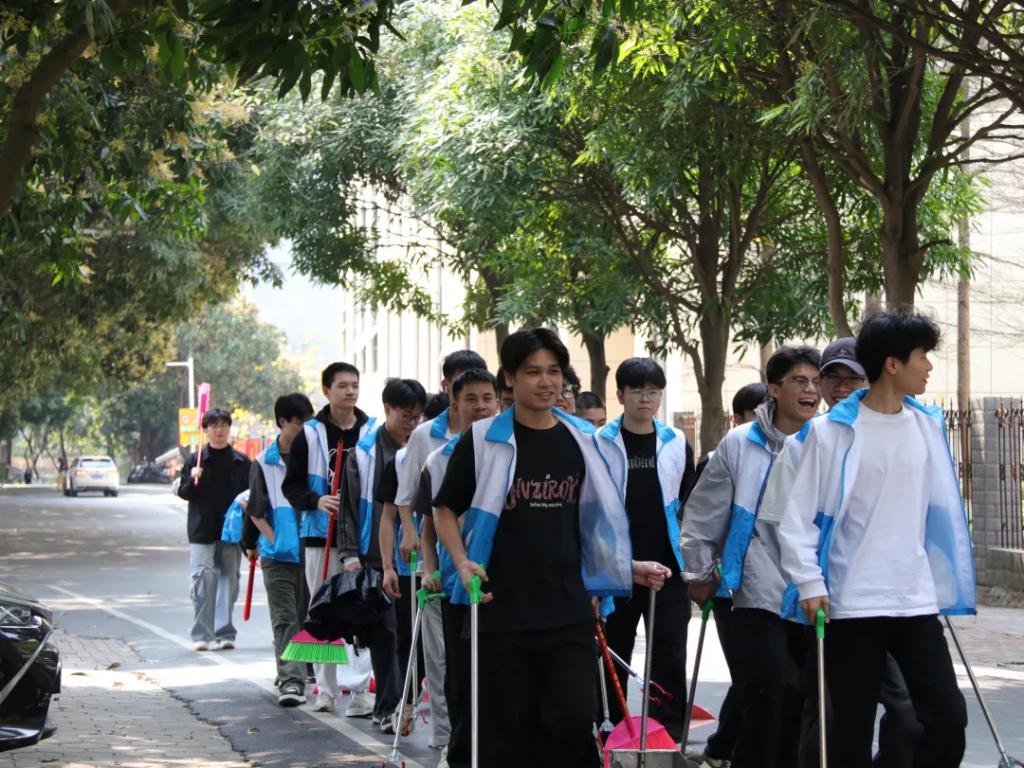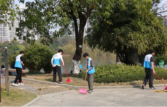 随后,同学们迅速前往相思湖公园,按照分工立即投入清扫工作。他们手持清洁工具,沿着河道及道路仔细清理垃圾、杂物和落叶,不放过任何卫生死角。同时,同学们还积极向周边居民宣传环保知识,倡导大家共同参与环境保护,强调创建文明城市需要每个人的共同努力。经过数小时的辛勤付出,河道周边环境焕然一新,整洁又清新。
