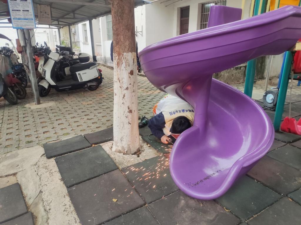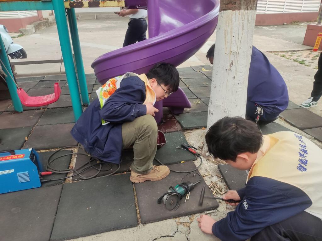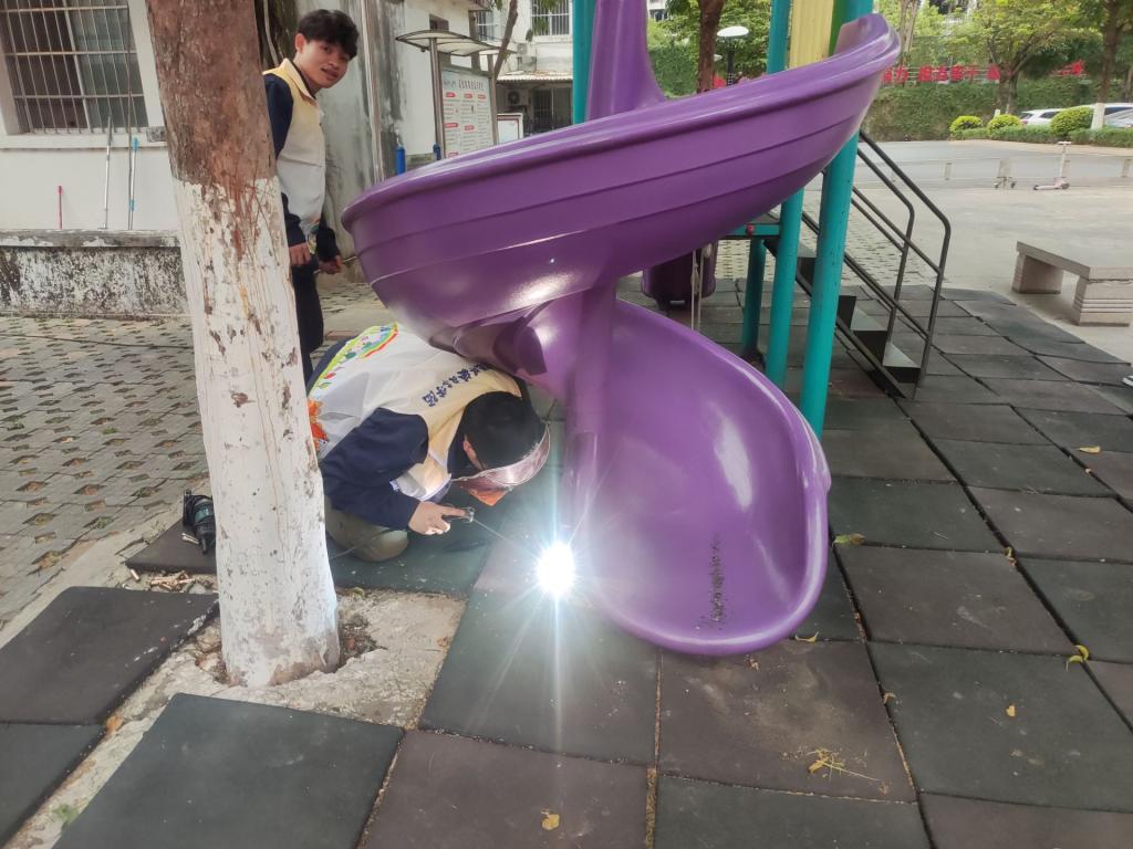 活动中,志愿者们对滑梯、秋千等游乐设施展开全面排查,重点检查焊接点稳固性、结构完整性及防护装置安全性。志愿者依托专业课程所学,对发现的老化螺丝、松脱焊缝进行标记并现场加固修复,同步清理地面碎屑、加固防护栏,消除潜在安全隐患。志愿者还向社区工作人员讲解日常维护要点,如定期检查焊接部位、避免尖锐物外露、定期进行防锈处理等,提升社区安全管理能力。