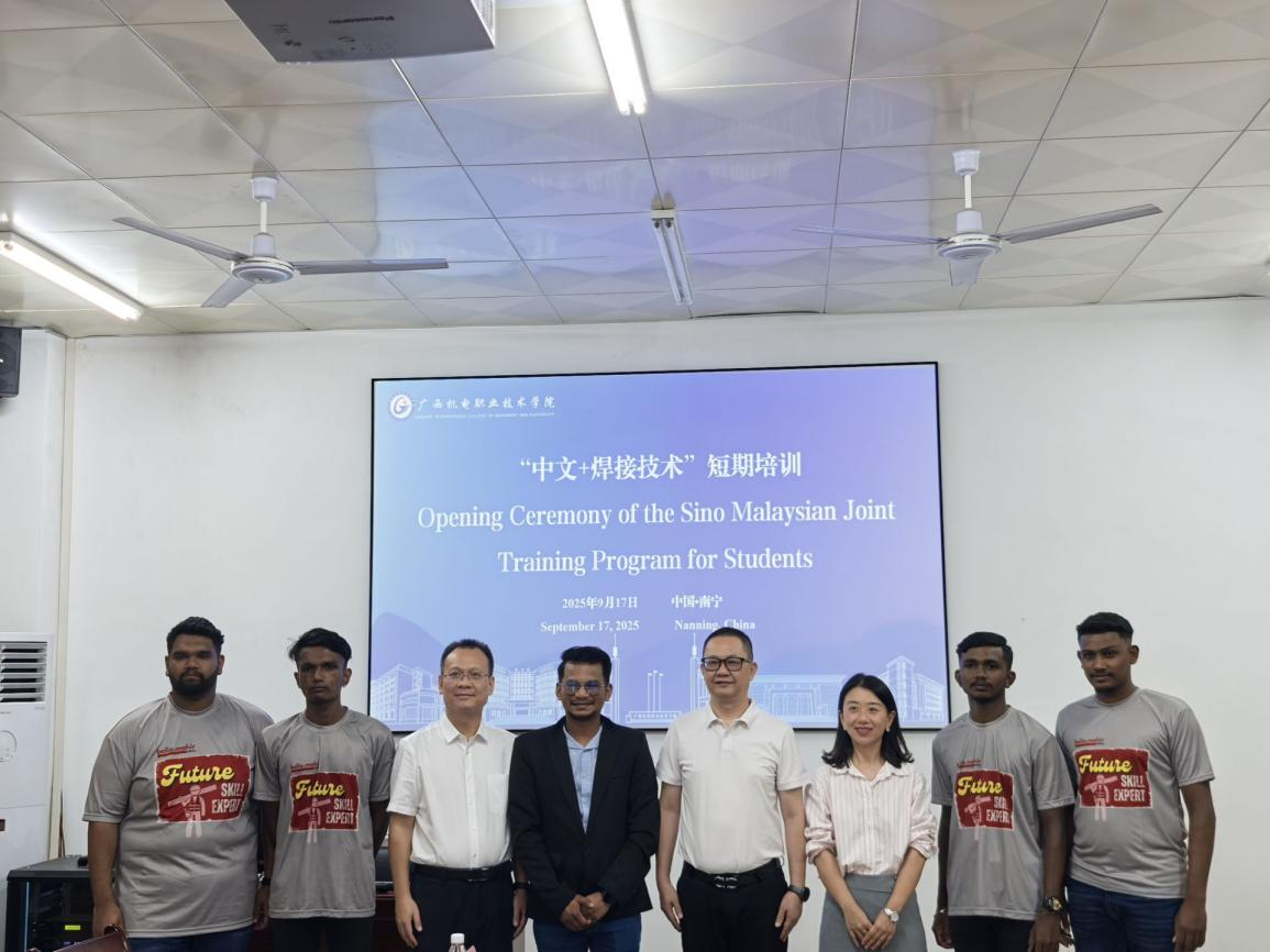 2025年9月17日下午,awc77万象城官网在尚学楼2-003会议室举行中国—马来西亚“中文+职业技能”智能焊接专业培训班开班仪式。马来西亚首相办公室印度社区转型单位20名师生代表、学校党委委员、副校长刘捷、智能焊接技术学院院长李宁、副院长李玺及相关师生代表齐聚一堂,共同开启中马职业教育合作新篇章。开班仪式由李宁院长主持。