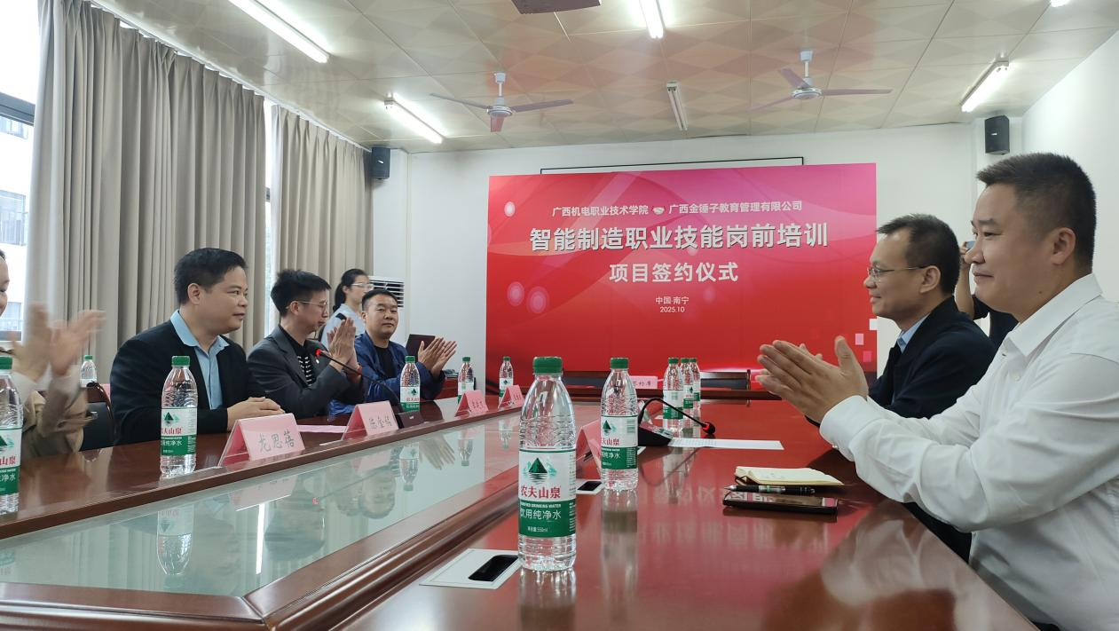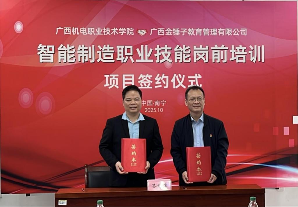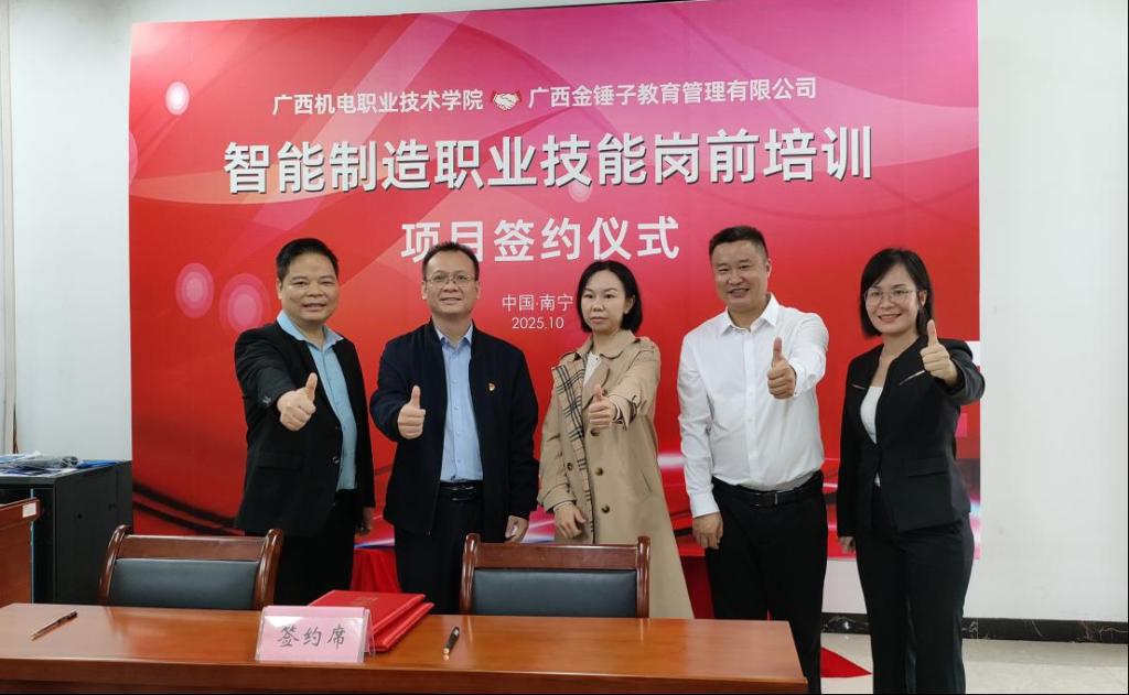金秋送爽,丹桂飘香。10月31日上午,我院与广西金锤子教育管理有限公司在智能焊接实训中心隆重举行联合开展智能制造职业技能岗前培训项目签约仪式。我院李宁院长、金锤子教育陈金铭总经理出席仪式并致辞,双方项目管理团队核心成员、区内多家普通高中及中职学校校长与教师代表以及新闻媒体人士等二十余位嘉宾共同见证了这一重要时刻。