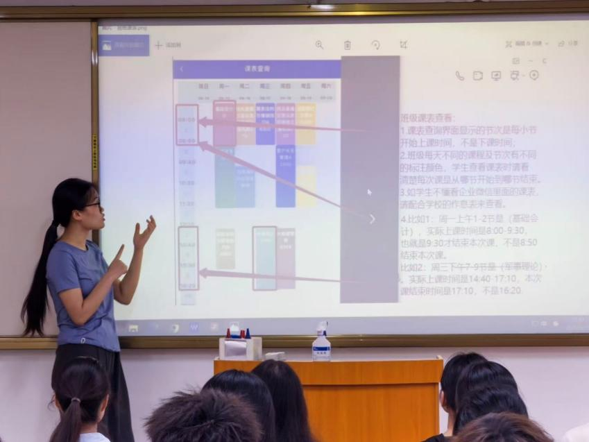 此外,入学教育活动还包含学生日常教学管理指导,老师重点讲解了校园教学管理核心内容,像如何通过企业微信、学生个人教务系统等平台查询课程安排、理解课表标识含义,以及日常上课考勤、学习任务提交等基础要求,助力新生快速适应大学教学管理模式,为后续学习做好准备。