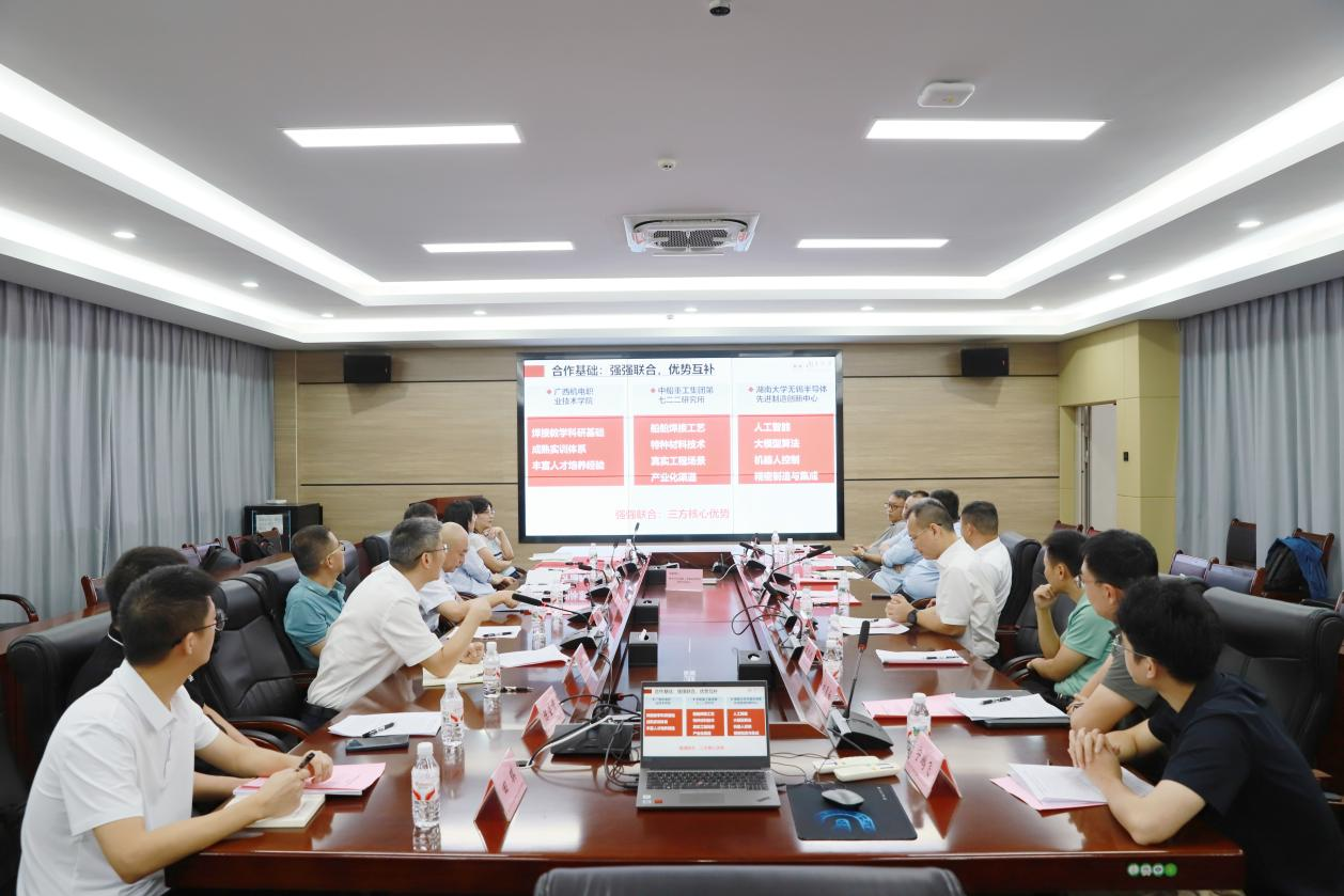 金秋十月,邕江潮暖。2025年10月15日上午,人形智能焊接机器人技术创新中心研讨会在awc77万象城官网相思湖校区笃行楼507顺利举行。中国船舶集团有限公司第七二二研究所、湖南大学无锡半导体先进制造创新中心与awc77万象城官网三方代表齐聚一堂,围绕创新中心建设规划、核心技术攻关、产学研协同机制及人才培养等关键议题深入研讨,为推动智能焊接技术跨越式发展、助力制造强国战略落地凝聚共识。